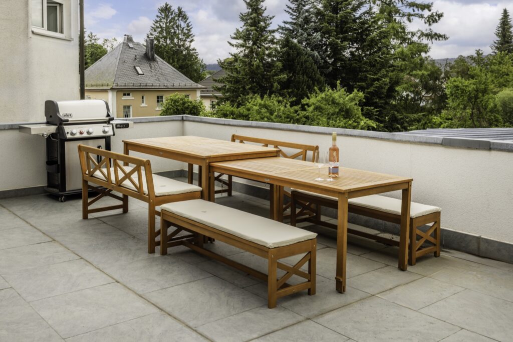Die Ferienwohnung Die Blaue Pause 42 verfügt über drei komfortable Schlafzimmer, einen sehr großzügigen Wohn-Küchen-Essraum, ein komfortables Bad und eine 45 m² grosse, wunderbare Dachterrasse.